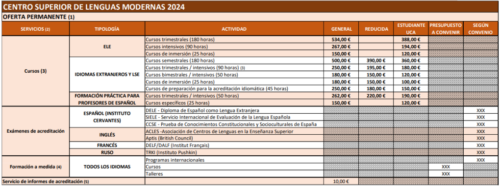 El Vicerrectorado de Internacionalización, competente de la oferta idiomática del Centro Superior de Lenguas Modernas (CSLM), propone los siguientes precios públicos aplicables a las actividades desarrolladas por el Centro Superior de Lenguas Modernas: